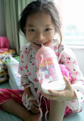 Lần đầu tiên trong đời được uống sữa, ảnh chụp sau khi Xa Diễm quay lại bệnh viện với số tiền được quyên góp giúp đỡ.