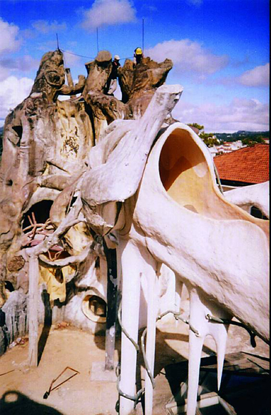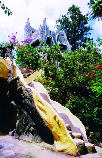 Với lối kiến trúc phá cách theo trường phái biểu hiện, tòa lâu đài trông tựa như những gốc cây hoặc một phần cơ thể của những con thú hoang dã ẩn hiện trong rừng già. Những ô cửa sổ lồi lõm hình thù kỳ lạ, xếp đặt có vẻ thiếu “ngăn nắp” nhưng nhìn kỹ thì như những con mắt của thú rừng. Du khách có thể ngắm nhìn khu vườn trong biệt thự với một tấm mạng nhện khổng lồ bằng sắt ở ngay lối vào.