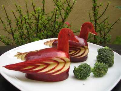 Với nhứng lát táo, cam, kiwi thái mỏng và xếp lần lượt từ to đến nhỏ xen kẽ, chồng lên nhau theo hình tròn, bạn sẽ có 1 bông hồng xinh xắn. Có thể bổ 1 quả dâu tây làm 4 phần, đặt 1 quả mận đỏ hoặc cherry vào giữa làm nhụy. Để làm lá thì vỏ quả dưa lưới rất hữu hiệu. Vậy là bông hồng từ các miếng trái cây thơm ngon đã hoàn thành. Khu vườn hoa cỏ