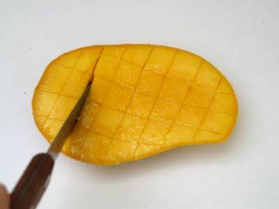 Step 2: Kế đó rạch những ô ngang dọc bên trong má miếng xoài, nhớ rạch tới sát vỏ nhưng đừng làm rách vỏ