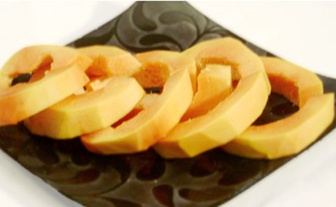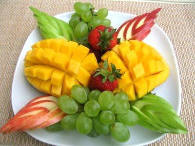 Trước tiên bổ đôi quả đu đủ theo chiều ngang, nếu đu đủ có hạt dùng thìa nạo bỏ hạt. Đặt đu đủ lên mặt thớt sạch hoặc đĩa. Một tay giữ đu đủ, một tay dùng dao gọt vỏ đu đủ từ trên xuống, xoay đĩa để tiếp tục gọt hết toàn bộ vỏ đu đủ. Như vậy là quả đu đủ đã được gọt sạch mà tay không hề chạm vào phần thịt của đu đủ. Tiếp theo là cắt đu đủ thành từng miếng, cắt như thế nào hoàn toàn có thể do cách riêng của bạn, nhưng cần nhớ hạn chế tối đa việc chạm tay vào đu đủ sẽ bảo đảm đĩa hoa quả tươi ngon hấp dẫn. Bạn có thể dùng dao bổ đôi từ trên xuống, sau đó chia thành nhiều miếng nhỏ và đặt các miếng vào đĩa theo hình đối xứng hoặc theo hàng đều nhau Dứa (Thơm) Cách 1: