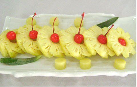 Cách thứ hai xử dụng dụng cụ bỏ lõi dứa. Dụng cụ này cũng có thể dùng với các loại hoa quả có ruột lõi như táo, lê... Với cách này, sau khi gọt vỏ bỏ mắt như thông thường, dứa được lấy bỏ phần lõi. Sau đó cắt khoanh tròn và xếp lên đĩa, thêm một vài quả dâu tây hoặc quả cherry là ta đã có một đĩa hoa quả đẹp mắt rất phù hợp mỗi khi nhà có khách. Cắt tỉa cho đĩa trái cây Làm cho đĩa trái cây tráng miệng thêm hấp dẫn là một nghệ thuật, bạn tha hồ sáng tạo, thể hiện các ý tưởng của mình với các loại hoa quả sẵn có. Bông hồng đa sắc