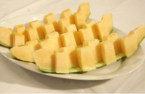 Vỏ dưa hấu hoặc dưa lưới nạo sạch ruột trở thành một chiếc thuyền xanh mát nổi bật trên nền “cỏ” bờ sông. Bờ sông ở đây được tạo nên từ những lát cam vàng cắt hình bán nguyệt. Kiwi cắt múi cau xếp như những bông hoa chớm nở. Phần cỏ xanh tước nhỏ lá dứa xếp xuống dưới. Trên thuyền vỏ dưa xếp những miếng dưa vàng, dâu tây và cam thái miếng vuông nhỏ. Một ý tưởng độc đáo mới lạ.