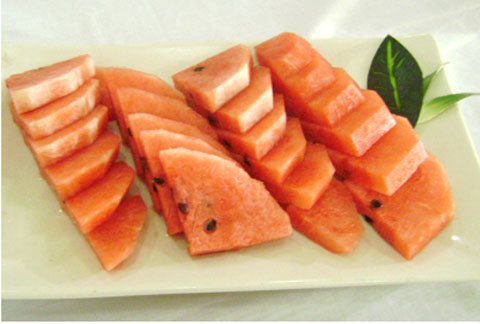 Tận dụng lớp vỏ màu đỏ của thanh long nhằm tạo ra những lớp điểm xuyết đẹp mắt trên nền trắng. Trước tiên bổ đôi dọc theo quả thanh long, dùng mũi dao lách dọc trên lớp vỏ, lưu ý không cắt quá sâu vào phần thịt của thanh long. Tiếp theo dùng mũi dao lột bỏ phần vỏ to, để lại 3 đường chỉ trên nửa quả thanh long. Dùng dao xắt thanh long thành từng lát dày khoảng 1cm, dàn chéo thanh long. Dưa hấu, dưa bở Cách 1: