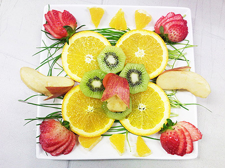 Lá dứa tước sợi nhỏ lót xuống dưới cùng. Những lát cam cắt tròn xếp 4 góc, tiếp đến là 4 lát kiwi đặt lên trên. Dâu tây 4 quả thái lát xếp xòe 4 góc đĩa. Táo và cam cắt miếng xếp xung quanh. Đĩa trái cây như một khu vườn hoa cỏ nhiều sắc màu rực rỡ. Chiếc thuyền dễ thương