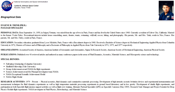 Trịnh Hữu Châu đã là niềm tự hào vĩ đại của người Việt khi anh hoàn tất hành trình bay vào vũ trụ cùng tàu con thoi Columbia lừng danh. Bạn có thể không biết được điều này, thế nhưng cả nước Mỹ biết điều này, hơn một nửa thế giới biết điều này. Trên trang bìa của nhiều tạp chí nước Mỹ đã xuất hiện gương mặt Trịnh Hữu Châu như là một kỳ tích châu Á tại NASA (Cơ quan hàng không vũ trụ Mỹ). Eugene Trịnh (tên khai sinh là Trịnh Hữu Châu) sinh ngày 24/09/1950 tại Sài Gòn. Ông là con trai út của kỹ sư công chánh Trịnh Ngọc Sang. Năm 1953, ông cùng với gia đình sang định cư ở Pháp, nơi đây chính là tiền đề phát triển sự nghiệp của chàng kỹ sư tài năng này.