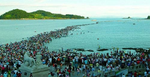 Hai lần một năm khi nước thủy triều xuống thấp, một dải dất dài 2,8 km và rộng 40 mét lộ ra, biến thành con đường kết nối đảo Jindo và Modo của Hàn Quốc trong một vài giờ.
