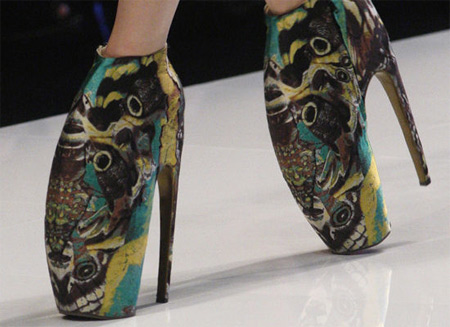 Người mẫu rón rén bước đi trong những đôi giày cao hơn 25 cm có hình thù kỳ quái trên sàn diễn thời trang ở Paris hôm qua. |