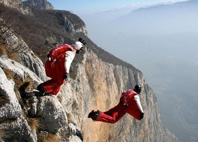 Hai vợ chồng Heather và Glenn Singleman nhảy từ đỉnh núi Brento, Italy với bộ quần áo có cánh để chứng minh họ có thể bay được. -