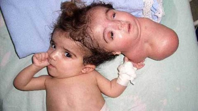 Bé gái có 2 đầu dính chặt.