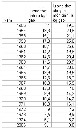 - Lương công nhân từ 1956 đến 1974 và lương công nhân năm 2006 - Giá gạo của các năm 1956 đến 1974, cùng giá gạo của năm 2006 - chỉ số giá tiêu thụ của công nhân từ 1956-1974 - so sánh lương công nhân và chỉ số giá tiêu thụ từ 1956-1974 - Lương công nhân tính ra kg gạo