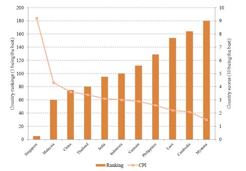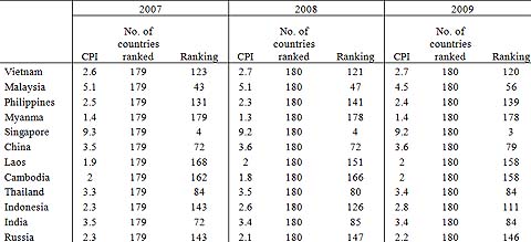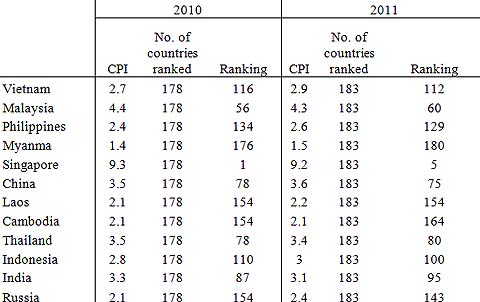 Tổ chức minh bạch quốc tế - Transparency International (TI) – vừa công bố bảng xếp hạng chỉ số cảm nhận tham nhũng (Corruption Perception Index - CPI) cho năm 2011. Theo đó, các nước trong khối ASEAN vẫn có đủ các đại diện trong nhóm tham nhũng ít nhất thế giới (Singapore) và nhiều nhất thế giới Trong khi đó, tiến bộ lớn nhất ở khu vực Đông Nam Á thuộc về Indonesia. Với 2,3 điểm năm 2007 (xếp thứ 143), Indonesia còn đứng sau cả Việt Nam và Philippines trong cùng năm này. Tới năm 2011, Indonesia đã đạt 3 điểm (xếp thứ 100), trên cả Việt Nam và Philipines (xem đồ thị).