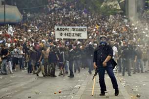 Người dân Hy Lạp biểu tình, bạo loạn gần tòa nhà Quốc hội Hy Lạp, Athens ngày 05/05/2010 để phản đối sự yếu kém của chính phủ. AFP PHOTO/ Aris MESSINIS.