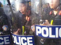 Hình do thính giả gửi đến RFA /Công an, cảnh sát cơ động được huy động đến ngăn cản tang lễ cụ bà Hồ Nhu ở Cồn Dầu, Đà Nẵng hôm 4-5-2010.