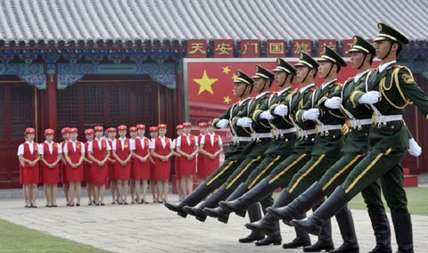Một chiến sĩ đang biểu diễn nghi thức treo cờ trên Quảng trường Thiên An Môn, trước sự chứng kiến của các nữ tiếp viên xinh đẹp. Ảnh: Xinhua