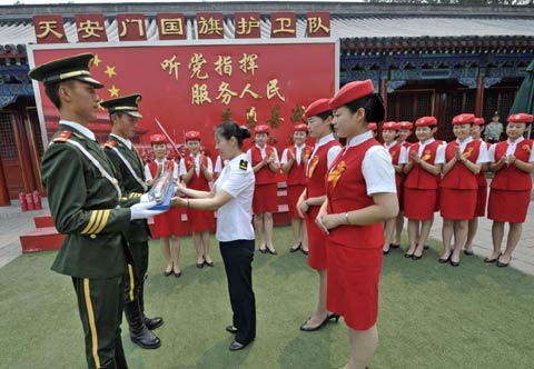 Cuối tháng 6, 18 nữ tiếp viên xinh đẹp của tuyến Bắc Kinh - Thiên Tân tập trung tại Quảng trưởng Thiên An Môn rèn luyện dưới sự hướng dẫn của các chiến sĩ cầm cờ. Ảnh: Xinhua