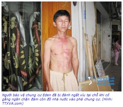 Khi chúng tôi chạy xuống được đến tầng trệt thì chứng kiến cảnh bảo vệ chung cư ngăn không cho vào vì bọn người này không xuất trình được giấy phép và chưa có mặt đại diện của chung cư theo Luật chung cư. Người bảo vệ này đã bị hành hung tàn nhẫn, có tính chất côn đồ bởi một người mặc áo xanh (sau này tôi mới biết được là cán bộ tư pháp phường Bến Nghé, tên Tiến), người này túm lấy tóc của bảo vệ chung cư, đánh liên tục vào ngực, đầu, mặt đến khi bảo vệ chung cư bất tỉnh tại chỗ. Chúng tôi bất lực chứng kiến cảnh tượng ghê rợn đó, cửa chung cư bị phá và hàng trăm nhân viên an ninh tràn vào chung cư. Trước cảnh tượng quá kinh sợ và quá bất ngờ, chúng tôi đành bất lực đứng nhìn cảnh chính quyền thực hiện hành vi vô pháp luật. Họ cho xe thang đến để tháo gỡ các biểu ngữ ghi những bất bình của người dân khu Eden. Họ điên rồi!
