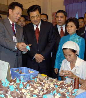 Nghi vấn về tham vọng cho Trung Quốc của Chủ Tịch Hồ Cẩm Ðào được đặt ra từ năm 2006, khi ông này qua Việt Nam dự thượng đỉnh APEC nhưng không tới ngay Hà Nội, mà đáp xuống Ðà Nẵng, đi thăm phố cổ Hội An và các cơ sở địa phương như trong hình, đi thăm nhà máy có chủ nhân Hong Kong, trước khi bay lên Hà Nội. (Hình: STR/AFP/Getty Images)