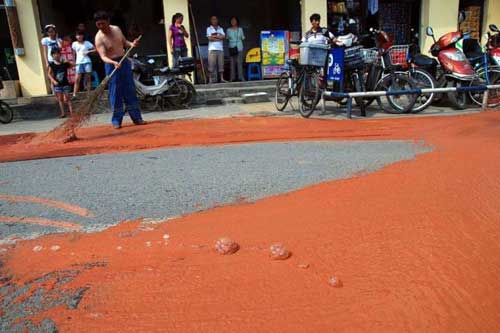 | Mặt đường sùi bọt đỏ kỳ lạ |