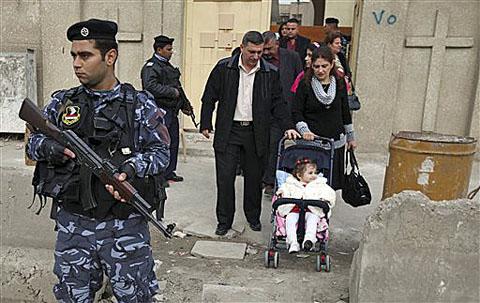 Các chủ chiên trong những thành phố Kirkuk và Mosul ở miền bắc và tại thành phố cảng Basra ở miền nam đã cho hủy bỏ thánh lễ truyền thống vào đêm Giáng sinh và đã yêu cầu các giáo dân không nên trang hoàng cho ngày lễ. (Ảnh: Cảnh sát Iraq bảo vệ lối vào một nhà thờ ở Baghdad, Iraq, ngày 24/12).