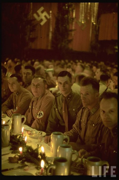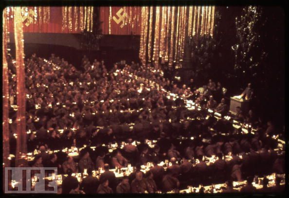 Ảnh 2: Toàn cảnh tiệc tại đại sảnh Löwenbräukeller. Bức ảnh này được Hugo Jaeger, một trong những nhiếp ảnh gia riêng của Hitler chụp. Trong bức ảnh, người xem có thể thấy những hàng dài kim tuyến lấp lánh buông xuống từ những xà ngang trong đại sảnh của hãng bia Löwenbräukeller, nơi mà những kẻ chỉ huy quân đội SS đang ngồi cùng nhau để thưởng thức buổi tiệc. Những bức ảnh này là một phần trong số rất nhiều tấm ảnh màu được Jaeger che giấu và chôn dưới đất, bên trong những chai thủy tinh ở vùng ngoại ô Munich vào năm 1945, khi chiến tranh sắp kết thúc. Lực lượng của các nước đồng minh đã tìm ra những bức ảnh này trong một cuộc lục soát căn nhà mà Jaegar đã từng ở. Ông đã đặt một chai rượu cô-nhắc trên những chai thủy tinh chứa ảnh để đánh lạc hướng sự chú ý của đội quân, đồng thời để che giấu nguồn gốc phát-xít của mình. Ông đào những bức ảnh này lên vào 10 năm sau đó, hắn bán chúng cho tạp chí LIFE. Tạp chí này đã đăng phần lớn số ảnh trên báo vào năm 1970.