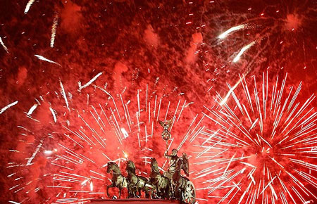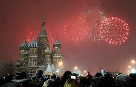 Pháo hoa đón năm mới ở Karachi, Pakistan. Tháp cao nhất thế giới Burj Khalifa tại Dubai vụt sáng khi đồng hồ điểm thời khắc giao thừa. Pháo hoa trên nhà thờ thánh Basil ở Quảng trường Đỏ, Mátxcơva, Nga. Có tới 1 triệu người từ khắp thế giới đã đổ về Cổng Brandenburg, Berlin, Đức, để thưởng thức màn ánh sáng và pháo hoa tuyệt đẹp. Pháo hoa rực rỡ trên bức tượng Quadriga ở Cổng Brandenburg, Berlin.