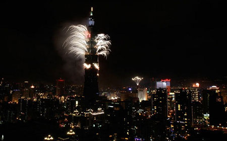 Pháo hoa thắp sáng bầu trời Vịnh Marina trước casino và khu nghỉ dưỡng nổi tiếng Marina Bay Sands khi màn trình diễn ánh sáng đón năm mới bắt đầu tại Singapore. Pháo hoa bắn từ tháp cao nhất Đài Loan, Taipei 101.