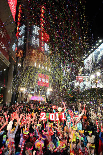 Người Hàn Quốc đổ về trung tâm Seoul trong thời khắc năm mới. Thả bóng chào năm mới ở chùa Zojo-ji, Tokyo, Nhật Bản. Đón năm mới trên Quảng trường Thời đại của Hồng Kông. Màn trình diễn ánh sáng thắp sáng bầu trời đêm Hồng Kông.