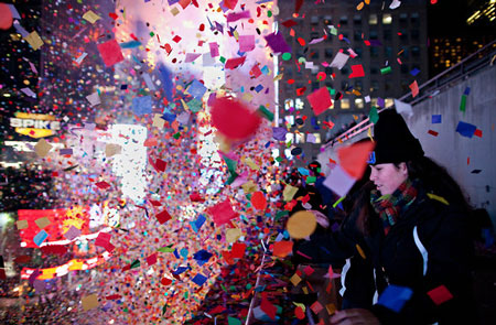 Hoa giấy được thả ngập tràn Quảng trường Thời đại, New York, Mỹ vào thời khắc giao thừa. Một tấm biển hiệu cao hơn 2m với dòng “2011” được thắp sáng bằng 453 bóng đèn.