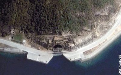 Căn cứ tàu ngầm nguyên tử thiết lập ngầm dưới đất ở Tam Á, phía Nam đảo Hải Nam. Trong hình là cửa dẫn vào căn cứ ngầm dưới đất. (Hình: London telegraph)