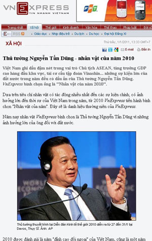 Trang báo điện tử VNExpress ngày 1 tháng 1, 2011 với bài “bình chọn” Thủ Tướng Nguyễn Tấn Dũng là “nhân vật năm 2010.” (Hình: Tiền Vệ) Tuy nhiên, VnExpress không nhắc đến bản gốc tiếng Ðức của công ty chế biến rác “RES-Resources, Ecology, Services GmbH” trên trang tiếp thị firmenpresse.de, chỉ nói là một bài báo từ “trang tin chuyên về chính trị Politik-Express của Ðức.” Kỳ thực, bài đăng ngày ngày 11 tháng 1, 2011 trên blog politikexpress.de chính là thông cáo báo chí đăng ngày 10 tháng 1, 2011 của công ty “RES-Resources, Ecology, Services GmbH.” Thú vị hơn nữa, chủ nhân trang blog politikexpress.de lại là chủ nhân của trang tiếp thị... firmenpresse.de, tức là công ty LayerMedia Inc! Vòng lẩn quẩn tương tự cũng được lặp lại với cái thông cáo báo chí thứ nhì. Tác giả Nguyễn Tôn Hiệt viết rằng, trang blog politikexpress.de không phải là một nhật báo, mà chỉ là một blog, không có ấn bản trên giấy, không có phóng viên, không có ký giả, và cũng như firmenpresse.de, hoàn toàn không có ban biên tập. Thế nhưng, qua một blog, qua một trang diễn đàn tự quảng cáo, và qua 2 tờ báo trong nước, thì một thông cáo báo chí để quảng cáo lại trở thành một tin... chính trị, biến một người trở thành “xuất sắc nhất Châu Á.” |
