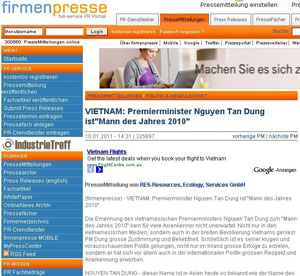 “Ngôi sao chính trị mới ở Châu Á: Thủ Tướng Việt Nam Nguyễn Tấn Dũng.” HÀ NỘI (TH) - Một ngày trước khi Ðại Hội Ðảng XI chính thức mở màn, tờ Pháp Luật Việt Nam (cơ quan tuyên truyền của Bộ Tư Pháp CSVN) ngày 11 tháng 1, 2011, viết một bài có tựa đề: “Thủ Tướng Nguyễn Tấn Dũng xuất sắc nhất Châu Á.” “Với nhan đề: Thủ Tướng Nguyễn Tấn Dũng-Nhân Vật Năm 2010, Nhật báo Firmenpress của CHLB Ðức nhận định Thủ Tướng Nguyễn Tấn Dũng đã rất thành công với các chính sách khôn ngoan, chiến lược và tầm nhìn xa trông rộng. Ông đã làm được nhiều việc mà các thủ tướng khác ở các nước Châu Á không làm được.” Hóa ra, bài báo này, theo tin dẫn trên tờ báo điện tử “lề trái” Tiền Vệ, lại là không có thật. Tin trên Tiền Vệ viết rằng, ở Ðức không hề có nhật báo nào tên là “Firmenpress.” Họ tìm hiểu lục lọi khắp các mạng tra cứu thì thấy có mạng “Firmenpresse.de” là một diễn đàn cung cấp dịch vụ quảng cáo điện tử. Ai muốn quảng cáo thì cứ gửi tới, tự làm lấy mẫu. Theo Tiền Vệ, firmenpresse.de do công ty LayerMedia Inc. làm chủ, văn phòng đặt tại Burgstr. 2, Filderstadt, BW 70794, Germany. Trang firmenpresse.de “là một trang chuyên đăng các bài ‘press release’ tự quảng cáo tiếp thị (PR) trong mọi lĩnh vực, từ thương mại, nghệ thuật, công nghệ, cho đến chính trị, do khách hàng tự viết gửi đến. Trang này còn hướng dẫn cho khách hàng thực hiện các Mẹo và Xảo thuật (Tipps und Tricks) để viết các bài tự quảng cáo tiếp thị có hiệu quả!” Ông Nguyễn Tôn Hiệt (người cất công tìm hiểu và viết bài đăng trên Tiền Vệ về sự thật của bài báo khen ông Dũng) viết trên Tiền Vệ, rằng ông lục tìm trên trang firmenpresse.de thì thấy có 2 thông cáo báo chí, quảng cáo tiếp thị về Nguyễn Tấn Dũng. Hai thông báo ấy do một khách hàng tên là “RES-Resources, Ecology, Services GmbH” gửi đăng ngày 10 tháng 1, 2011 và ngày 12 tháng 1, 2011. Tác giả Nguyễn Tôn Hiệt viết rằng, qua tìm hiểu, ông biết công ty này chuyên về các dịch vụ chế biến rác và vệ sinh môi trường. Ông Nguyễn Tôn Hiệt liệt kê: Tờ thông cáo báo chí thứ nhất được công ty “RES-Resources, Ecology, Services GmbH” đăng trên firmenpresse.de, có nhan đề “Việt Nam: Thủ Tướng Nguyễn Tấn Dũng là ‘Nhân vật của năm 2010,’ đăng ngày 10 tháng 1, 2011. Thông cáo này dài hơn 600 chữ, có nội dung gần giống bài của VnExpress đăng ngày 1 tháng 1, 2011. Ðến ngày 11 tháng 1, 2011, báo Pháp Luật Việt Nam tung ra bài “Thủ Tướng Nguyễn Tấn Dũng Xuất Sắc Nhất Châu Á.” Ngay sau khi báo Pháp Luật Việt Nam tung ra bài của mình, công ty RES-Resources, Ecology, Services GmbH lại dựa vào bài ấy, viết thêm thông cáo báo chí thứ nhì, khoảng 450 chữ, đăng lên firmenpresse.de, với nhan đề “Ngôi sao chính trị mới ở Châu Á: Thủ Tướng Việt Nam Nguyễn Tấn Dũng.” Bài này đăng ngày 12 tháng 1, 2011. Nội dung của thông cáo báo chí này gần như lặp lại nội dung bài của báo Pháp Luật Việt Nam. Cùng ngày 12 tháng 1, 2011, báo VnExpress tung ra bài “Báo nước ngoài ca ngợi ‘Nhân Vật của Năm’ - Thủ Tướng Việt Nam,” dài hơn 900 chữ. “Báo nước ngoài” ở đây lại chính là thông cáo báo chí mà công ty “RES-Resources, Ecology, Services GmbH” đăng ngày 10 tháng 1.