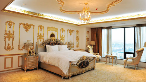 Có hai phòng tổng thống với giá cao ngất: phòng 325m2 giá 3.900 USD/đêm, còn phòng 410m2 giá 6.200 USD/đêm, tức hơn 125 triệu đồng. Kim loại màu vàng dát đầy trên các chi tiết trang trí trong phòng, theo như lời kể của ban quản lý khách sạn. Bước vào căn phòng này, sờ tay vào cái giường ngủ của “tổng thống”, ta có cảm giác như mình đang bước vào một bảo tàng kim hoàn.