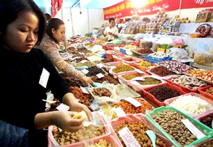 Gian hàng mứt Tết không thấy che đậy. AFP Trước những quan ngại của giới tiêu thụ, các cơ quan y tế đang cho tăng cường những đoàn kiểm tra đến những cơ sở sản xuất thực phẩm, phục vụ Tết nguyên đán, song song với việc thường xuyên nhắc nhở doanh nghiệp, nhà sản xuất phải chấn chỉnh, khắc phục những yếu kém, đồng thời xử phạt nghiêm khắc những hiện tượng gây báo động về an tòan thực phẩm, hầu tránh những hậu quả có thể xảy ra cho dân chúng, khi cả nước mừng xuân, đón Tết năm Mẹo, sắp đến.