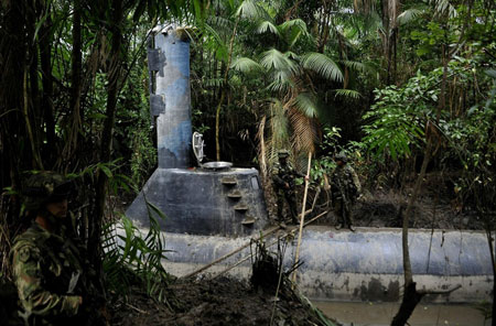 Mẻ lưới của hải quân Colombia hôm 13/2 tóm được một chiếc tàu ngầm tự chế bằng chất liệu sợi thuỷ tinh đặc biệt tinh vi, cho thấy phương tiện buôn lậu ma tuý của các băng đảng tội phạm nước này ngày càng hiện đại.