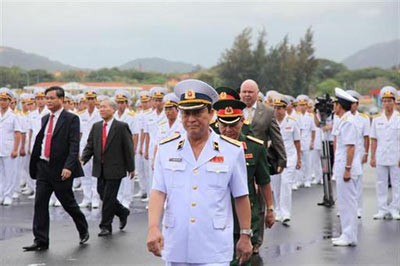 Tàu được trang bị hệ thống hỏa tiễn Uran với tầm bắn 130km gồm 2 ống phóng, một đại bác 76.2 ly, một hệ thống pháo kép 30 ly tự động. Chiến hạm được trang bị 2 ống phóng ngư lôi và mìn để chống tàu ngầm. Chiến hạm được trang bị 2 ống phóng ngư lôi và mìn để chống tàu ngầm. Tàu cũng có sân đậu cho một trực thăng nhưng không thấy tin tức cho biết Việt Nam có mua loại trực thăng chống tàu ngầm của Nga trang bị cho chiến hạm như Ka-27, Ka-28 hay Ka-31 hay không. Theo Vitinfo “Ðinh Tiên Hoàng” là “chiến hạm dùng để thực hiện các nhiệm vụ như tìm kiếm, theo dõi và chống lại các mục tiêu trên không, ngầm và nổi; tiến hành các chiến dịch hộ tống và hoạt động tuần tiễu, cũng như bảo vệ các đặc khu kinh tế ở biên giới quốc gia trên biển.” Tư lệnh Hải Quân Việt Nam, Phó Ðô Ðốc Nguyễn Văn Hiến (giữa) trong buổi lễ tiếp nhận khu trục hạm Ðinh Tiên Hoàng. (Hình: Vitinfo) Những tin tức ban đầu nói tàu này có vận tốc 23 hải lý nhưng nay Vitinfo nói: “Qua quá trình cải tiến, tàu đã đạt được vận tốc vượt chỉ số vận tốc khi thiết kế (21 hải lý thay vì 18 hải lý).” Chưa thấy tin tức cho hay khi nào thì chiếc Gepard 3.9 thứ hai chính thức gia nhập lực lượng hải quân của Việt Nam dù đã được hạ thủy và chạy thử từ tháng 3 năm ngoái. Với sự tiếp nhận khu trục hạm nói trên, tuy khả năng của Việt Nam được cải thiện phần nào nhưng còn quá nhỏ bé để bảo vệ biển đảo trước một Trung Quốc bá quyền bành trướng và hùng mạnh. Người ta chỉ thấy phát ngôn viên Bộ Ngoại Giao Hà Nội đưa ra các lời phản đối suông mỗi khi Trung Quốc có các hành động xâm phạm chủ quyền biển đảo của Việt Nam. (TN) |