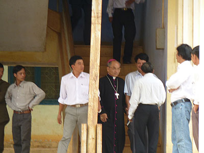 Giám Mục Hoàng Ðức Oanh, giám mục địa phận Kontum, bị “mời” về trụ sở xã Sơn Lang, huyện K'bang, tỉnh Gia Lai hạch hỏi về Thánh lễ Phục Sinh mà ngài dâng ở xã. (Hình: Giáo phận Kontum)