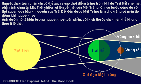 Nguyệt thực, và các loại nguyệt thực Trái Đất được Mặt Trời chiếu sáng đồng thời cũng cản các tia sáng từ Mặt Trời tạo ra một vùng bóng tối trải dài trong không gian. Nguyệt thực diễn ra khi Mặt trăng trên quỹ đạo chuyển động của mình đi vào vùng bóng tối này. Khi ấy Mặt Trăng không còn được Mặt Trời chiếu sáng trực tiếp, do đó ánh Trăng không còn sáng như bình thường. Vị trí trái đất nằm giữa Mặt trời và Mặt trăng giải thích vì sao ngày diễn ra nguyệt thực luôn là ngày trăng tròn, khi ấy nhìn từ trái đất, trăng đang vào pha tròn cực đại. Ánh sáng từ Mặt Trời chiếu tới Trái Đất sẽ để lại phía sau vùng bóng tối và vùng nửa tối (hay còn gọi là vùng bóng mờ). Khi Mặt Trăng đi vào vùng nửa tối ta có Nguyệt thực nửa tối. Quan sát hiện tượng này ta chỉ thấy Mặt Trăng chỉ mờ đi một chút so với bình thường rất khó thấy sự khác biệt. Khi Mặt Trăng đi vào vùng bóng tối ta có Nguyệt thực một phần. Hiện tượng này cho ta thấy cung tròn của bóng Trái Đất hiện rõ trên Mặt Trăng. Chính nhờ hiện tượng này mà nhà thiên văn Aristos đã phát hiện ra Trái Đất có hình cầu. Khi Mặt Trăng đi qua và nằm hoàn toàn trong vùng bóng tối ta có Nguyệt thực toàn phần, đây là trường hợp ta sẽ quan sát được vào rạng sáng ngày 16/6/2011 sắp tới đây Mặt trăng “máu” Khi nguyệt thực toàn phần diễn ra Mặt trăng đôi lúc sẽ có màu đỏ như máu, điều đó khiến cho Nguyệt thực mang sắc thái rất huyền bí ở một số nền văn hóa. Theo dân gian Việt Nam ngày xưa, nguyệt thực còn gọi là hiện tượng “gấu ăn trăng”, Mặt trăng đang bị một con gấu khổng lồ đang nuốt mất. Mọi người phải khua chiêng đánh trống làm huyên náo để đuổi con gấu đi trả lại ánh trăng sáng của đêm rằm. Ngày nay chúng ta đều biết Nguyệt thực là chỉ là một hiện tượng thiên nhiên đặc biệt, và có thể tính toán từ trước dựa theo chu kì chuyển động của Trái Đất và Mặt Trăng. Theo một câu chuyện lịch sử, chính vì nhờ có cuốn lịch thiên văn luôn mang theo mình mà vào năm xưa, ngày 29/2 năm 1504, nhà thám hiểm vĩ đại Christ Columbus đã lợi dụng hiện tượng nguyệt thực để cứu đoàn thám hiểm của ông khỏi sự bao vây của những thổ dân da đỏ. Khi nguyệt thực diễn ra, mặt trăng bị nuốt chửng bởi một màu đỏ kì quái, người da đỏ đã vô cùng hoảng loạn. Christ Columbus lừa họ rằng đó là dấu hiệu giận dữ của Chúa do người da đỏ đã đối xử không tốt với đoàn của ông. Nhà thám hiểm vĩ đại tuyên bố là với quyền năng của mình ông có thể xin Chúa rủ lòng thương, và tự giam mình vào phòng tối trong khoảng 50 phút để nói “chuyện riêng” với Chúa. Kì thực, “quyền năng” của ông chỉ là một chiếc đồng hồ cát để đo thời gian diễn ra nguyệt thực đã được tính toán trong quyển lịch thiên văn. Ngay khi nguyệt thực sắp sửa kết thúc Columbus bước ra khỏi căn phòng và tuyên bố Chúa đã tha thứ và kì diệu thay, gần như ngay lập tức Mặt trăng sáng tỏ trở lại. Người da đỏ sau đó đã thần phục Columbus và đổi xử tốt với đoàn thám hiểm của ông Những thổ dân da đỏ ở Jamaica đang cầu xin Chiristopher Columbus (1451-1506) hãy trả lại Mặt trăng cho họ (Image by Frederic Lewis/Getty) Vậy tại sao Mặt trăng lại chuyển sang màu ửng đỏ mà không phải là tối đen khi nguyệt thực toàn phần? Điều này được giải thích vì ngay cả khi Trái đất chặn các tia từ Mặt trời, thì ánh sáng Mặt trời vẫn rẽ ra xung quanh rìa của Trái đất, và ánh sáng này được phản chiếu lên trên Mặt trăng. Ánh sáng từ Mặt Trời có thành phần bao gồm đủ các màu với các bước sóng khác nhau. Khi ánh sáng Mặt trời đi xuyên qua lớp khí quyển Trái Đất các bước sóng ngắn như màu xanh, tím .. sẽ bị khí quyển hấp thụ gần như hoàn toàn, chỉ còn ánh sáng đỏ có bước sóng ánh sáng dài là có khả năng đâm xuyên mạnh nhất đi qua. Đồng thời bầu khí quyển Trái Đất như là một thấu kính hội tụ khổng lồ làm cho ánh sáng đỏ đi xuyên qua có xu hướng lệch về trục chính của vùng bóng tối và ánh sáng này đã chiếu rọi Mặt Trăng khi nó đi qua vùng này. Do đó ta thấy Mặt Trăng có màu đỏ khi diễn ra Nguyệt thực. Mặt trăng sẽ thay đổi những sắc thái khác nhau trong suốt các giai đoạn diễn ra của Nguyệt thực, bắt đầu từ màu xám đen tới màu đỏ đồng có thể cả màu hổ phách. Độ rực rỡ của màu đỏ này có thể sẽ bị ảnh hưởng bởi mật độ bụi, và hơi nước của bầu khi quyển Trái Đất vào thời điểm diễn ra Nguyệt Thực Nguồn tham khảo: NASA, Space, thienvanhoc.org