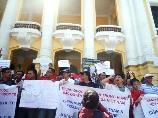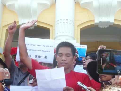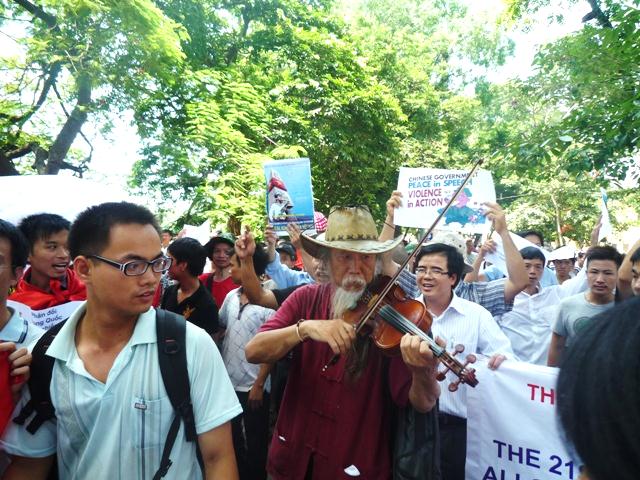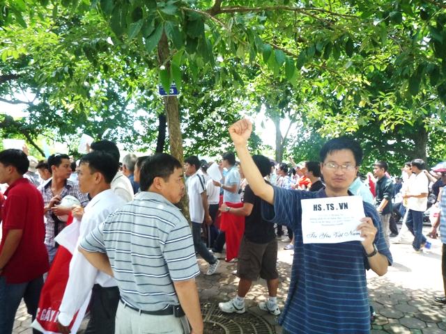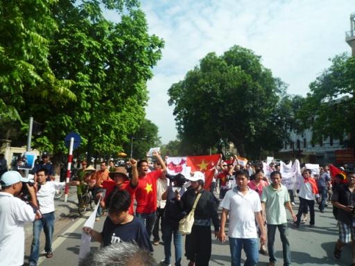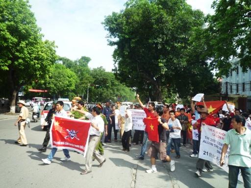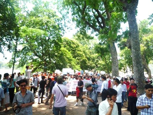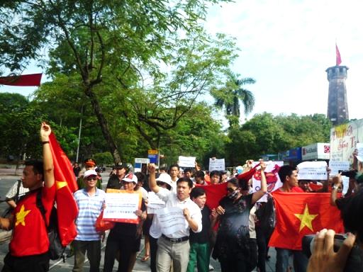 Nguồn: Ba Sàm Nguyễn Xuân Diện - tường thuật trực tiếp từ Hà Nội: 07h 40: Vẫn như mỗi chủ nhật cuối tuần từ 5 tuần nay, quanh khu vực ĐSQ TQ hiện đang thực hiện: Đặt rào chắn chặn đường Hoàng Diệu, đặt biển cấm trên khu vực bao quanh Vườn hoa Le-nin. Các lực lượng an ninh đã tụ tập xunh quanh khu vực ĐSQ và vườn hoa. Hôm nay có thêm 1 nét mới: Tại trước cửa quán cafe Cột Cờ (vẫn đóng cửa, vẫn có biển cấm): Đặt thêm 1 biển cấm quay phim chụp ảnh (hình như biển này cứ thích đặt ở đâu thì đặt, một cách tùy tiện) và đặt sẵn 1 dây thừng to ngang qua đường, để khi cần thì chỉ cần kéo lên là ngăn người đi qua. Sáng sớm nay, thấy có một xe bus to đùng đỗ cạnh cafe Cột Cờ, về gần ngã tư Trần Phú – Điện Biên, đến nay (7h46) đã thấy không còn đứng ở đó. Trên hè đường sát cafe Cột Cờ có mấy chị trông quen quen, chắc là các chị ở Thành đoàn HN.(?). Sốt ruột, KTS Trần Thanh Vân nói: Tôi hỏi anh Ba: “Xuống đường chưa?”. Anh Ba trả lời: “Lên đường”. “XUỐNG ĐƯỜNG” là hình tượng xuống cầu thang, xuống bậc thềm, ra đường đi biểu tình. “LÊN ĐƯỜNG” là biểu trưng chí khí, kết thúc giây phút nghỉ ngơi, LÊN ĐƯỜNG ĐI ĐẤU TRANH. 8h30: CUỘC BIỂU TÌNH BẮT ĐẦU NỔ RA