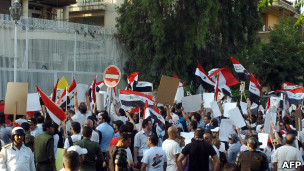 Trước đó lực lượng bảo vệ của Đại sứ quán Pháp đã bắn chỉ thiên để đẩy lùi một đám đông trung thành với ông Assad. Cuộc biểu tình diễn ra vài ngày sau khi đại sứ Mỹ và Pháp viếng thăm thành phố Hama ở miền trung, nơi đã diễn ra cuộc xuống đường lớn chống chính phủ hôm thứ Sáu. 'Một quan chức của Sứ quán Mỹ ở Damascus nói với BBC có thiệt hại vật chất nhưng không có nhân viên nào bị thương. Quan chức này nói chính phủ đã trấn an sẽ cung cấp bảo vệ đầy đủ cho sứ quán. Nhưng trong trường hợp này nhà chức trách phản ứng chậm, quan chức này nói thêm. ''Chó'' Các nhân chứng cho AP biết những người biểu tình đã đập cửa kính và kéo một lá cờ Syria lên trong khuôn viên sứ quán. Họ cũng vẽ khẩu hiệu bài Mỹ, gọi ông Đại sứ Robert Ford, là ''chó", các nhân chứng nói. Quan chức sứ quán Mỹ nói câu chuyện ở đây không phải là sứ quán bị tấn công, mà là chính quyền tiếp tục giam cầm, tra tấn, và giết hại công dân chỉ vì họ muốn biểu tình.