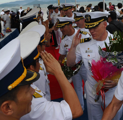 Hải quân Việt Nam đón tiếp các sĩ quan của 3 chiến hạm Hoa Kỳ là USS Chung-Hoon, USS Preble và USS Safeguard ghé thăm Ðà Nẵng hôm 15 tháng 7. Việt Nam đang muốn dựa vào Hoa Kỳ để làm đối trọng với Trung Quốc trên hồ sơ biển Ðông. (Hình: HOANG DINH NAM/AFP/Getty Images)