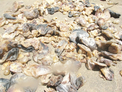 Cá nóc gai vớt từ biển sâu. (Hình: Báo Tiền Phong) Nghề này nguy hiểm vì cá nóc gai là loại thú dữ. Bị bắt lên bờ, khi còn sống, con cá nóc gai sẵn sàng đớp cụt ngón tay những người vô ý để gần miệng cá. Báo Tiền Phong dẫn lời của một ngư dân dày dặn kinh nghiệm là ông Nguyễn Văn Cảnh 53 tuổi, ngụ tại xóm Gành Cả, huyện Bình Sơn, Quảng Ngãi cho biết thức ăn “khoái khẩu” của cá nóc gai là... san hô và đá sỏi trong lòng biển. Ðưa một mảnh san hô vào miệng cá, người ta nghe tiếng nhai rào rạo ngon lành. Còn nữa, ở độ sâu 20m, nghe tiếng động của thợ lặn thì lập tức cá nóc gai hút nước để thân căng tròn như quả bóng và dựng đứng tua tủa hàng trăm chiếc gai nhọn hoắt. Phải hết sức khéo léo, người thợ lặn dùng một cây sắt nhọn dài 1m đâm chết cá nóc và nhất là phải đâm xuyên qua nách cá làm cho nó xẹp dí rồi mới xúc vào vợt. Ông Cảnh cũng cho biết, mỗi con cá nóc gai nặng khoảng 7 kg có thể dùng xẻ lấy thịt ăn. Còn bong bóng cá và bộ gai tua tủa kể cả da được giữ lại để bán. Bong bóng cá phơi khô đắt tiền chờ xuất cảng. (Hình: Báo Tiền Phong) Một ngư dân khác cũng cho biết, cá nóc gai đang hút trên thị trường. Người ta bán bong bóng cá phơi khô với giá 50 Mỹ kim mỗi kg. Trung bình mỗi chuyến tàu của ông Cảnh có thể mang về mấy tạ da và bong bóng cá nóc phơi khô. Một số ngư dân Quảng Ngãi còn cho biết, nhiều người Việt Nam không biết cách ăn nên có đến 45% số người ăn cá nóc bị trúng độc chết. Trong khi đó, người Trung Quốc coi lá gan, tinh hoàn và da cá nóc là món khoái khẩu. Họ cũng cho rằng thứ nguy hiểm nhất ở cá nóc là ruột của nó. Chỉ cần bóc tách, bỏ ruột, rửa sạch sẽ là an toàn.