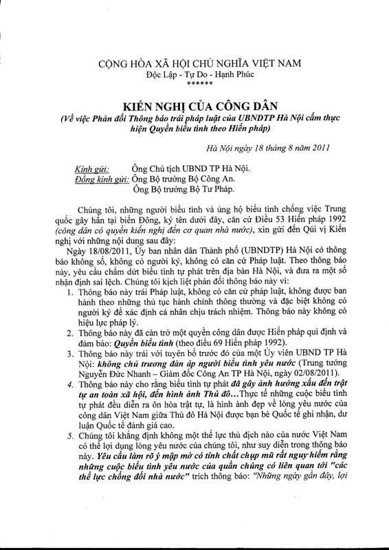 Chúng tôi, những người biểu tình và ủng hộ biểu tình chống việc Trung quốc gây hấn tại biển Đông, ký tên dưới đây, căn cứ Điều 53 Hiến pháp 1992 (công dân có quyền kiến nghị đến cơ quan nhà nước), xin gửi đến Qúi vị Kiến nghị với những nội dung sau đây: