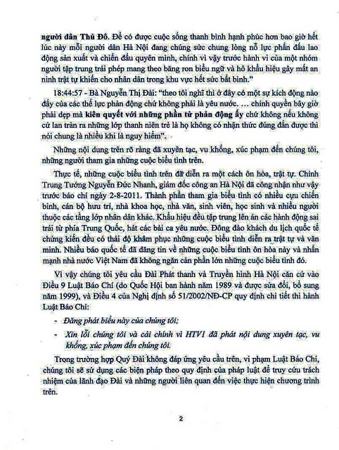 Lời bình của HTV1: 18:42:37 … “Thời gian gần đây lợi dụng vỏ bọc yêu nước một nhóm người bị các thế lực phản động trong nước và nước ngoài kích động đã tụ tập biểu tình hòng lôi kéo những người nhẹ dạ cả tin không nắm bắt thông tin đầy đủ gây ảnh hưởng xấu đến an ninh trật tự, cản trở và chống đối lực lượng chức năng làm nhiệm vụ.” …. 18:43:14 - Ông Nguyễn Đức Thành, một cựu chiến binh phát biểu: về những người biểu tình “…dâng khẩu hiệu và nói bậy nói bạ… ” Lời bình của HTV1: 18:44:03 … “là những người con của Hà nội đã từng cầm súng ra trận bảo vệ tổ quốc các cựu chiến binh như ông Khoa ông Thành vô cùng bức xúc trước những hành động tự phát của một số kẻ xấu đã chà đạp lên tình cảm yêu nước chân chính của người dân Thủ Đô. Để có được cuộc sống thanh bình hạnh phúc hơn bao giờ hết lúc này mỗi người dân Hà Nội đang chúng sức chung lòng nỗ lực phấn đấu lao động sản xuất và chiến đấu quyên mình, chính vì vậy trước hành vi của một nhóm người tập trung trái phép mang theo băng rôn biểu ngữ và hô khẩu hiệu gây mất an ninh trật tự khiến cho nhân dân trong khu vực hết sức bất bình.” 18:44:57 - Bà Nguyễn Thị Đài: “theo tôi nghĩ thì ở đây có một sự kích động nào đấy của các thế lực phản động chứ không phải là yêu nước. … chính quyền bây giờ phải dẹp mà kiên quyết với những phần tử phản động ấy chứ không nếu không cứ lan tràn ra những lớp thanh niên trẻ là họ không có nhận thức đúng đắn được thì nói chung là nhiều khi là nguy hiểm”. Những nội dung trên rõ ràng đã xuyên tạc, vu khống, xúc phạm đến chúng tôi, những người tham gia những cuộc biểu tình trên. Thực tế, những cuộc biểu tình trên đã diễn ra một cách ôn hòa, trật tự. Chính Trung Tướng Nguyễn Đức Nhanh, giám đốc công an Hà Nội đã công nhận như vậy trước báo chí ngày 2-8-2011. Thành phần tham gia biểu tình có nhiều cựu chiến binh, cán bộ hưu trí, nhà khoa học, nhà văn, sinh viên, học sinh và nhiều người thuộc các tầng lớp nhân dân khác. Khẩu hiệu đều tập trung lên án các hành động sai trái từ phía Trung Quốc, hát các bài ca yêu nước. Đông đảo khách du lịch quốc tế chứng kiến đều có thái độ khâm phục những cuộc biểu tình diễn ra trật tự và văn minh. Nhiều báo quốc tế đã đăng tin về những cuộc biểu tình ôn hòa này và nhấn mạnh nhà nước Việt Nam đã không ngăn cản phần lớn những cuộc biểu tình đó. Vì vậy chúng tôi yêu cầu Đài Phát thanh và Truyền hình Hà Nội căn cứ vào Điều 9 Luật Báo Chí (do Quốc Hội ban hành năm 1989 và được sửa đổi, bổ sung năm 1999), và Điều 4 của Nghị định số 51/2002/NĐ-CP quy định chi tiết thi hành Luật Báo Chí: - Đăng phát biểu này của chúng tôi; - Xin lỗi chúng tôi và cải chính vì HTV1 đã phát nội dung xuyên tạc, vu khống, xúc phạm đến chúng tôi. Trong trường hợp Quý Đài không đáp ứng yêu cầu trên, vi phạm Luật Báo Chí, chúng tôi sẽ sử dụng các biện pháp theo quy định của pháp luật để truy cứu trách nhiệm của lãnh đạo Đài và những người liên quan đến việc thực hiện chương trình trên. Chúng tôi cũng giữ quyền truy cứu trách nhiệm hình sự đối với những cá nhân đã phát biểu vu khống chúng tôi trong chương trình trên và các chương trình tương tự khác. Để làm rõ hơn những vấn đề liên quan chúng tôi đề nghị ông Tổng giám đốc Đài tiếp và trao đổi với những người tham gia các cuộc biểu tình trên tại Quý Đài vào 15 giờ 30 ngày Thứ Ba, 30-8-2011, nhằm tránh những phát sinh, hiểu lầm phức tạp có thể xẩy ra. Kính chào Ông. Những người ký tên vào thư yêu cầu này: Nguyên Ngọc Nguyễn Đăng Quang Nguyễn Huệ Chi Nguyễn Quang A Nguyễn Văn Khải (xác nhận qua điện thoại) Phạm Xuân Nguyen Vũ Ngọc Tiến Nguyễn Xuân Diện Lê Dũng Nguyễn Đức Mậu Bùi Thị Minh Hằng Nguyễn Chí Đức Phạm Văn Chính Nguyễn Tiến Nam Lã Việt Dũng *******