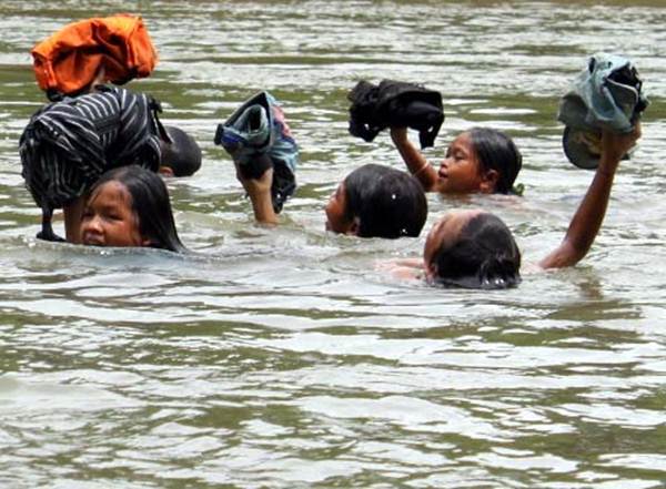 Gần một năm nay, học sinh bản Ông Tú và Ka Oóc xã Trọng Hoá phải bơi qua sông học chữ.