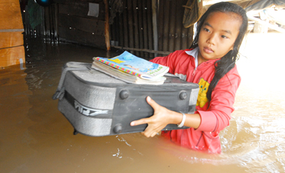 Học sinh miền Tây di tản để tránh lụt. (Hình: Báo Tuổi Trẻ) Họ ở trên lán và bè như vậy để chờ nước rút. Cũng theo báo Tuổi Trẻ, chính quyền xã Tân Hóa đề nghị phá hang Con Chuột tại địa phận này để nước thoát ra sông với chi phí lên tới 15 tỉ đồng tức khoảng 750,000 đô. Tại các tỉnh miền Tây như An Giang, Châu Ðốc, Kiên Giang... nước lụt dâng cao vượt kỷ lục từ 10 năm trở lại đây. Báo Tuổi Trẻ cho biết, nhiều làng mạc bị cô lập giữa biển nước mênh mông. Dân chúng trong vùng ngập sâu phải rời bỏ nhà cửa để tránh lụt. (P.L.)