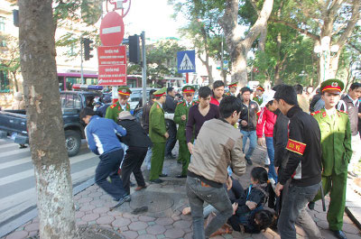 Công an và côn đồ đeo băng đỏ tấn công giáo dân bên bờ hồ Hoàn Kiếm. (Hình: Nữ Vương Công Lý)