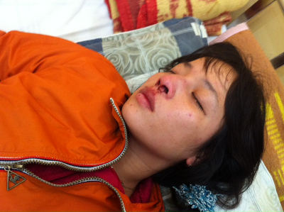 Một nữ giáo dân bị đánh giập mũi, chảy máu. (Hình: Nữ Vương Công Lý)