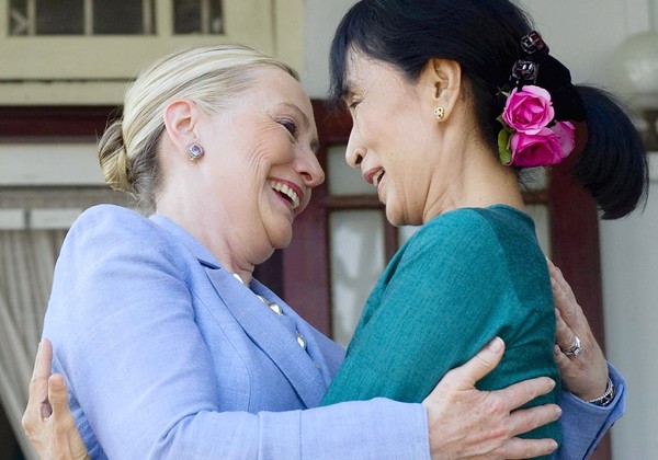 Bà Aung San Suu Kyi một lần kia đã nói:” Cha mẹ tôi đã phục vụ đất nước này và tôi cũng thế, dù có phải chết.” Director Luc Besson và tài tử nổi tiếng Michelle Yeoh (Dương Tử Quỳnh) tại đại hội điện ảnh liên hoan quốc tế Toronto, Canada Lời bàn: Chính quyền mới của Miến Điện, tổng thống Thein Sein (sau khi tướng độc tài quân phiệtThan Shwe về hưu 2010) với những quyết định can đảm đứng đắn, thay đổi đột ngột (360) trong thời gian gần đây như thả bà San Suu Kyi và nhiều nhà dân chủ đối lập, nhanh chóng dân chủ hóa đất nước, để thoát khỏi nanh vuốt Trung Quốc (con hổ giấy). Phải chăng cũng là một bài học lớn cho Việt Nam. Mất đảng nhưng không mất nước. Ngoại trưởng Hoa Kỳ Hillary Clinton (trái) thăm bà Aung San Suu Ky tại Burma tuần qua. (Associated Press, Saul Loeb / December 2, 2011). The Lady, người đàn bà gan lì, cành hoa lan sắt thép.