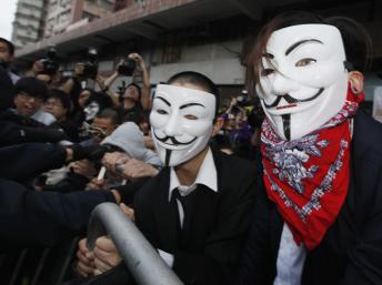 « Trong những năm qua, chính phủ cộng sản Trung Hoa đã áp đặt những luật lệ bất công đối với người dân » Người biểu tình tại Hồng Kông mang mặt nạ Anonymous trong cuộc xuống đường phản đối chính quyền Trung Quốc can thiệp vào việc bầu lãnh đạo Hồng Kông. Ảnh ngày 01/04/ 2012